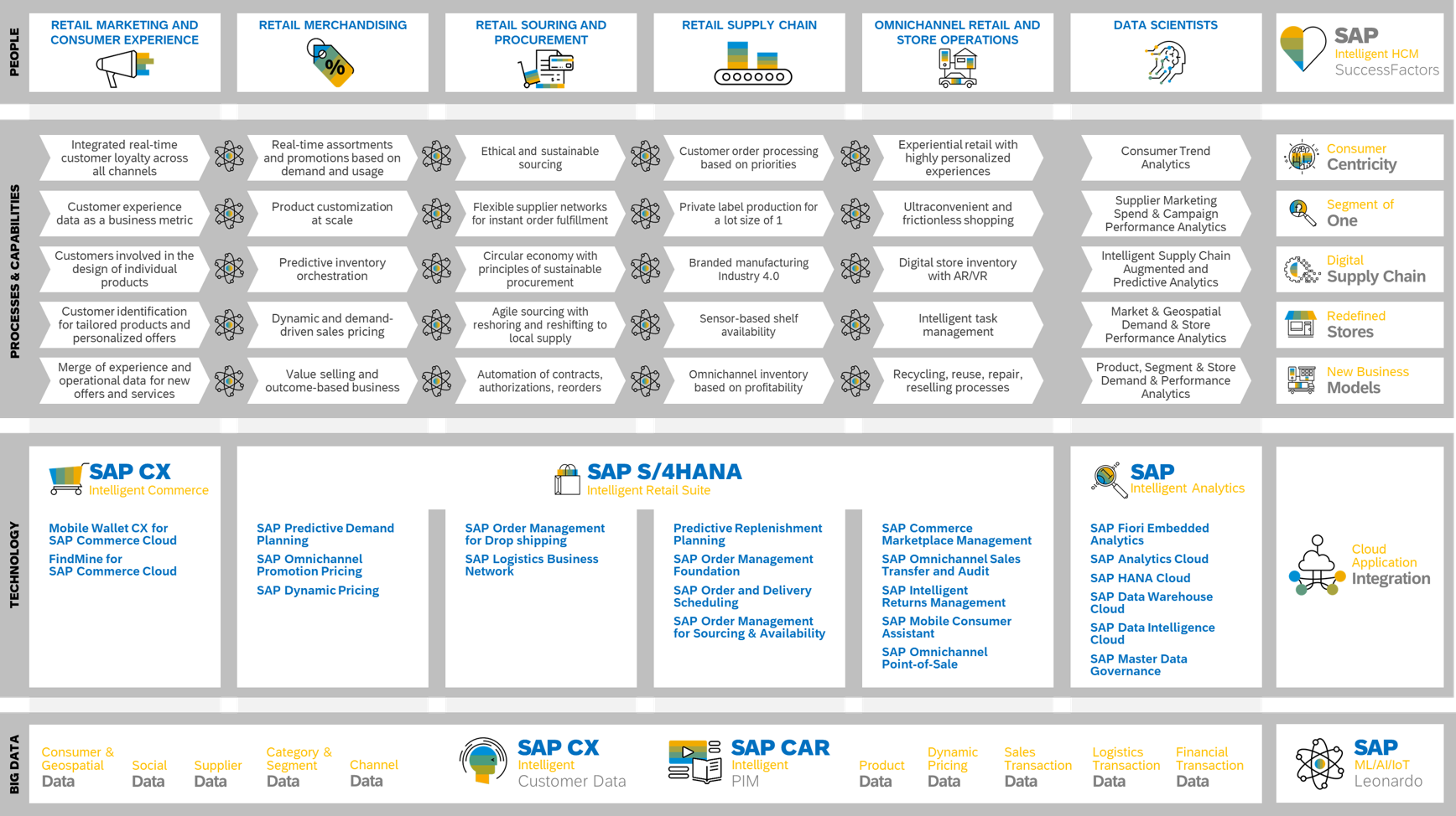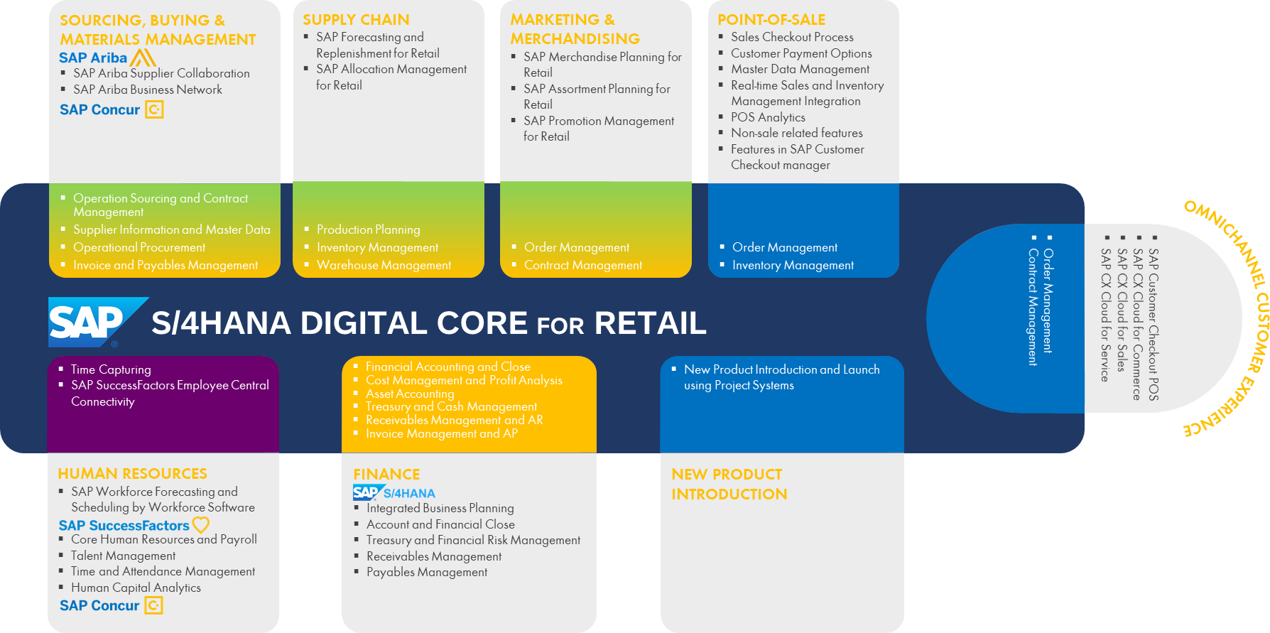 Our holistic services and support approach integrates all SAP S/4HANA Retail cloud solutions to enable cross value chain insights based on new machine-learning predictive and augmented analytics. Our expertise in digital transformation and its components: strategy, data, processes, project execution, and technology across retail, commerce, marketing, merchandising, assortment planning and allocation management areas delivers true digital business re-invention. We are committed to helping our retail customers reduce time to value, redefine their stores, and derive the maximum value from SAP solutions.