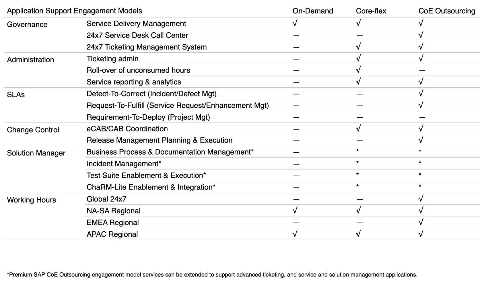 The Savantis Application Support Core-flex engagement model provides customers a simple, fixed monthly allocation of hours to support your productive SAP applications. Customers can consume a fixed number of hours monthly of skilled SAP talent, at a lower hourly price point, to augment their current CoE capabilities. Savantis’ depth and breadth of SAP skilled resources are consumed in a just-in-time manner to resolve defects, execute service requests, and deliver small projects — with a fixed monthly commitment of hours that can be consumed anyway you like. As its name suggests, this model provides flexibility for those customers with existing CoEs that require a higher level of ongoing support at a fixed monthly budget. Service request intake is managed on a weekly basis by our Service Delivery Manager (SDM) that is responsible for management and coordination of assigned work items and tickets. All in-process and closed tickets with hours consumed are reported to the client support leader weekly. Additionally, the SDM assists with full CAB change control processing for transport release into production systems