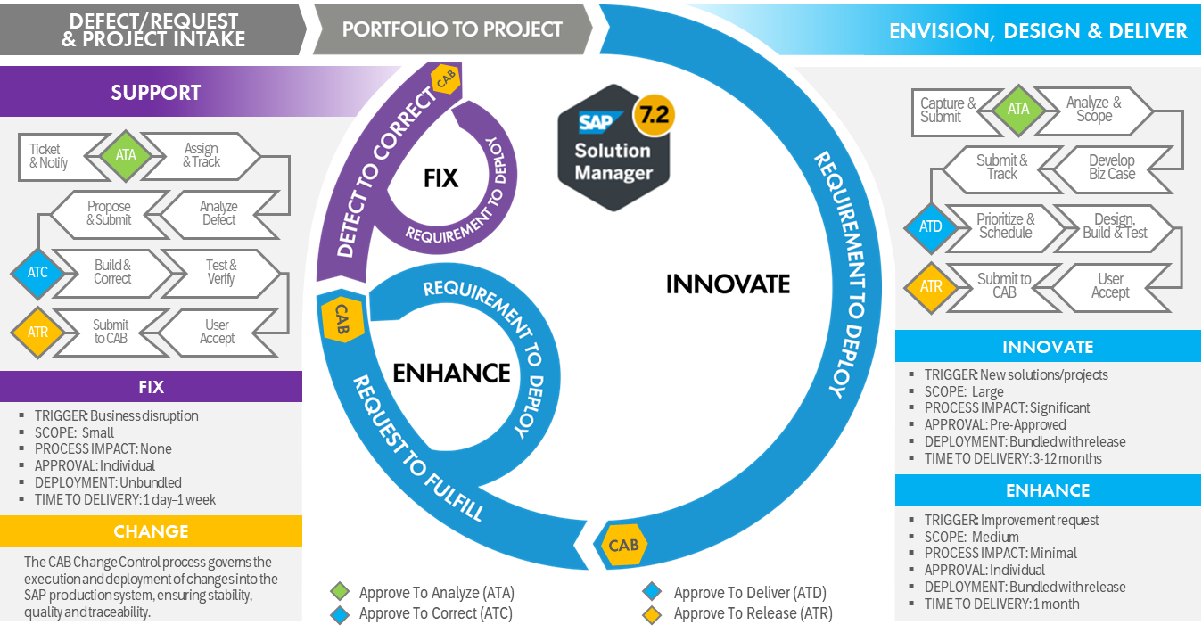The ENHANCE Request-To-Fulfill scenario, controls the enhancement request management lifecycle. This process uses a slightly different enhancement intake process that is focused on managing the design, build, test, and deploy processes where we work collaboratively with our customers’ business leads and analysts to ensure net new functionality meets the business requirements of the business user community before detailed build and test activities begin. The Change Advisory Board plays the leading role in the validation and acceptance of system changes before they are approved and transported into the SAP productive instance.