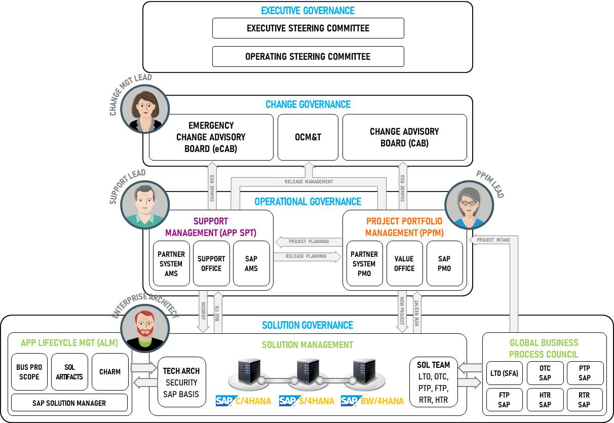 Operational Governance evaluates ongoing issues, risks, performance, and achievement and is focused on day-to-day internal activities, where issues and risks can be raised and addressed in a timely manner. This function is often comprised of both the Project and Portfolio Management and the Support Management components. This collaboration between groups focuses on prioritizing and staging projects and ad hoc changes, from emergency changes to service requests. Operational Governance leaders interface daily with leaders from the Solution Governance component, and together with Change leaders, comprise the Operating Steering Committee.