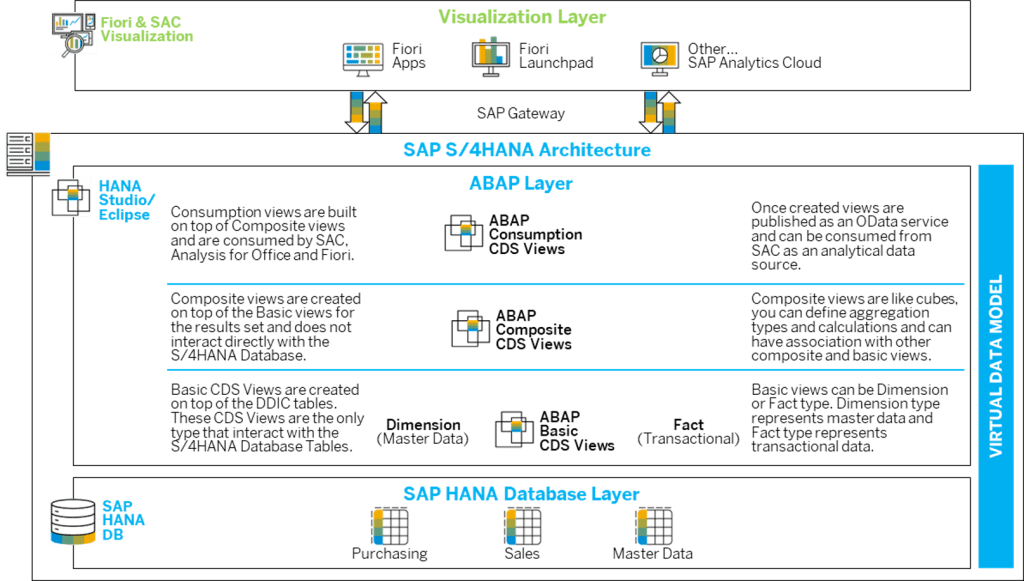 From a technical perspective, SAP devised a new way of accessing these optimized tables—Core Data Services (CDS) views. CDS simplifies and harmonizes the way you define and consume your data models. Technically, it is an enhancement of SQL which provides the data definition language for defining semantically rich database tables and views (CDS entities) and user-defined types in the database. Overall, the concept of the Virtual Data Model was introduced with SAP HANA Live as a virtual data model that sits on top of the suite of tables which uses native SAP HANA SQL views called calculation views for real-time operational reporting.